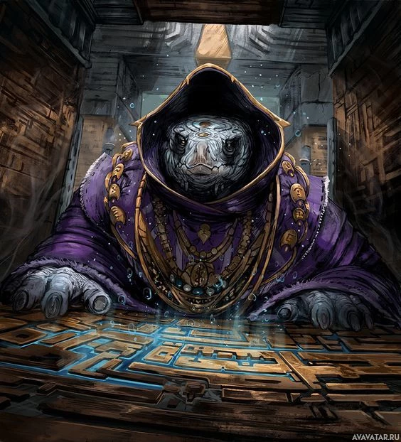 turtle character, appearing to be a wizard or mage with a fantasy theme. The character is wearing a purple