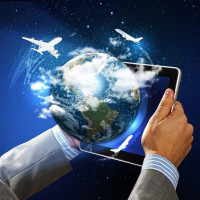 The image depicts a person holding a tablet with their left hand, which displays an image of Earth. There are several airplanes flying around the globe on the screen. This suggests that the image is related to travel, global transportation, or