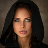 The image features a woman with a brunette hair color. She is wearing a hooded cloak and has a neutral expression on her face. There's a strong focus on her eyes, which are looking directly at the camera. Her makeup is done in a way that highlights her facial features. The lighting in the photo creates a moody atmosphere.
