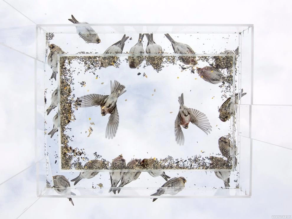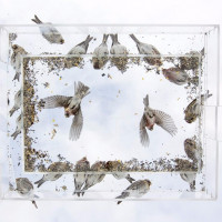 a group of birds, likely sparrows, inside a square-shaped enclosure that appears to be made of glass. The birds are on the ground and in flight, with some feeding on what looks like seeds or bird food scattered around them. The setting suggests it might be an aviary or