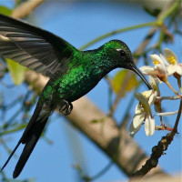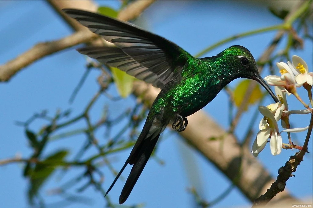 Картинка показывает колибри в полете. Он имеет радужные зеленые и синие крылья, которые отражают свет, что характерно для радужности, обнаруженной у многих видов птиц, чтобы помочь им слиться с окружающей средой. Колибри питаются нектаром из белых цветов. Этот тип взаимодействия распространен среди колибри, поскольку они в основном потребляют нектар для пропитания.