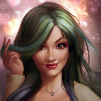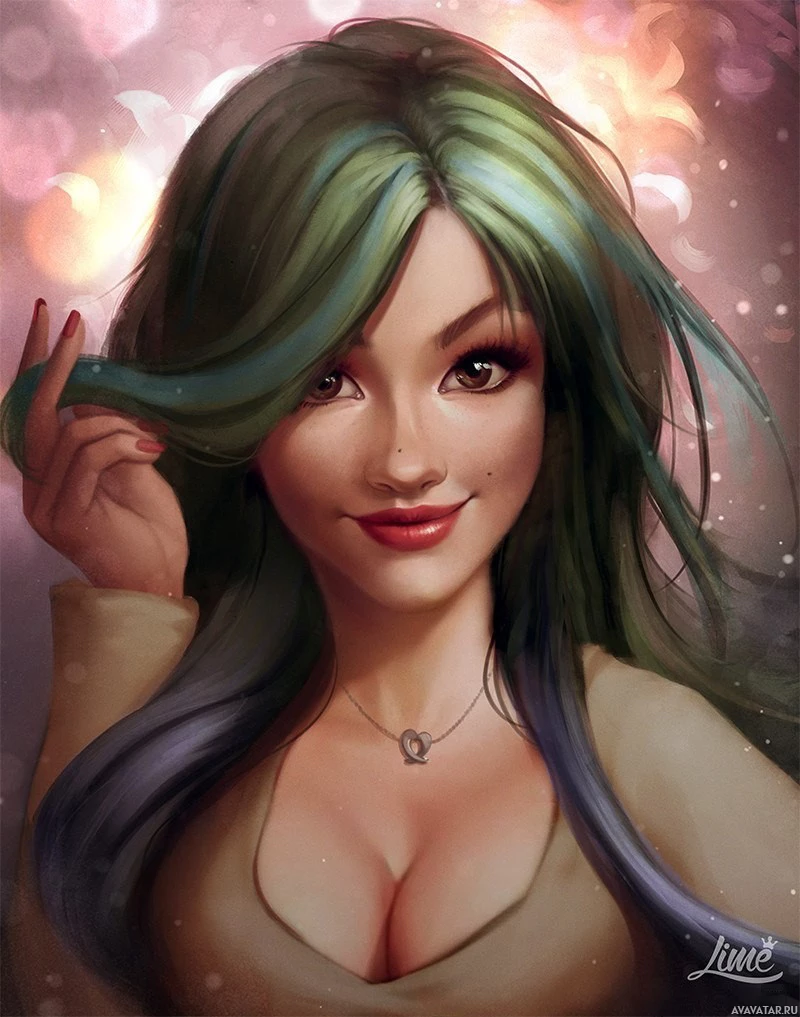a young woman with green hair and blue highlights. She has prominent eyelashes,