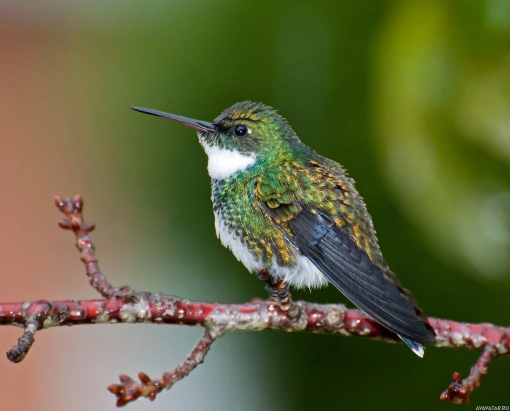 Картинка показывает колибри, сидящего на ветке. Колибри известны своим переливающимся оперением, которое часто включает оттенки зеленого, белого и черного или других цветов. У них длинные клювы, которые они используют для питания нектаром из цветов.