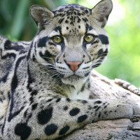 a natural setting with trees and foliage around it. The animal is looking directly at the camera, displaying its large pupils typical of cats that are adapted for low-