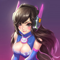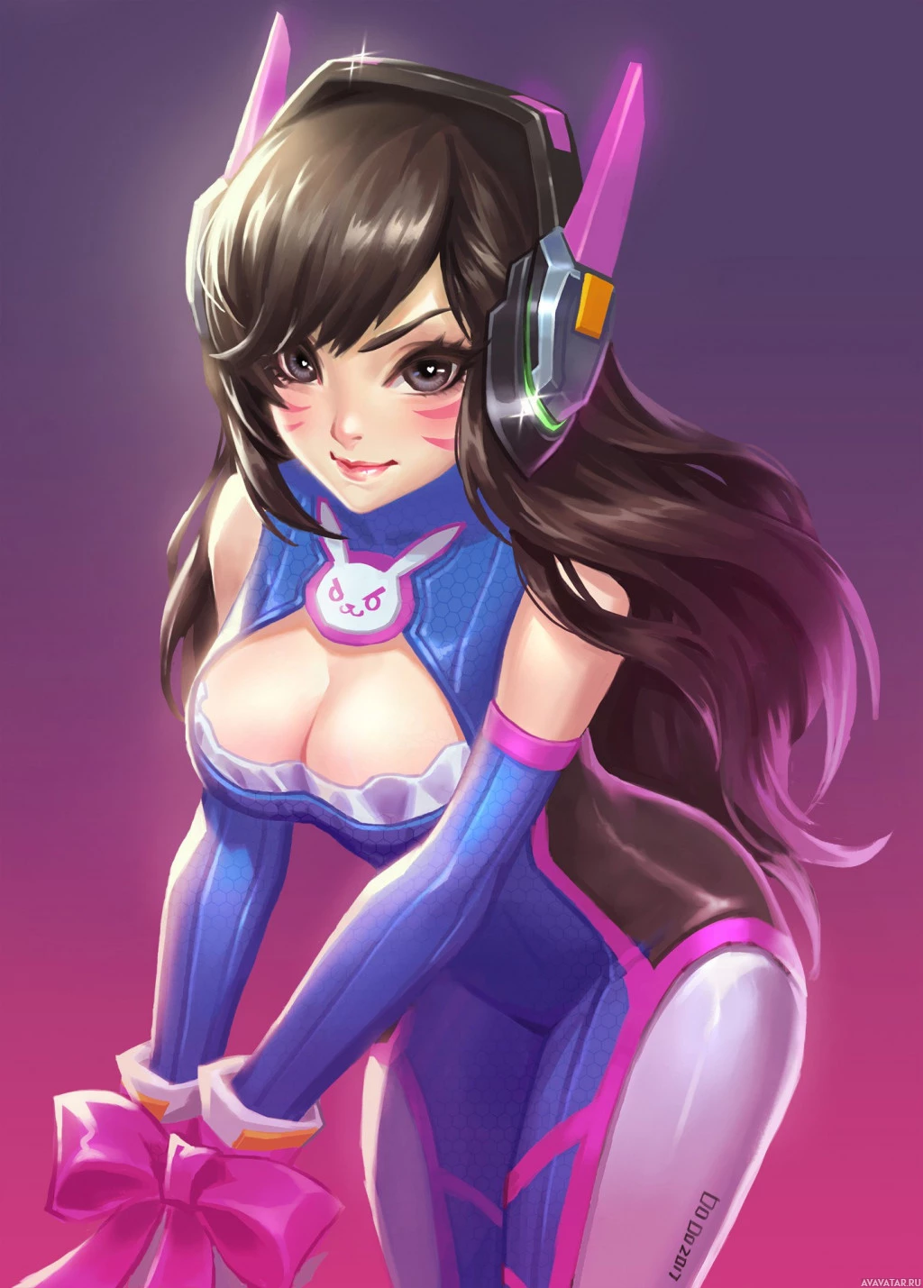 iconic suit with pink accents and is wearing headphones with a microphone. In one hand, she has what looks like a hammer, which is part of her character's design. The background suggests a digital or virtual environment, possibly indicative of the game setting where D.Va is known for being