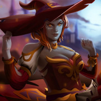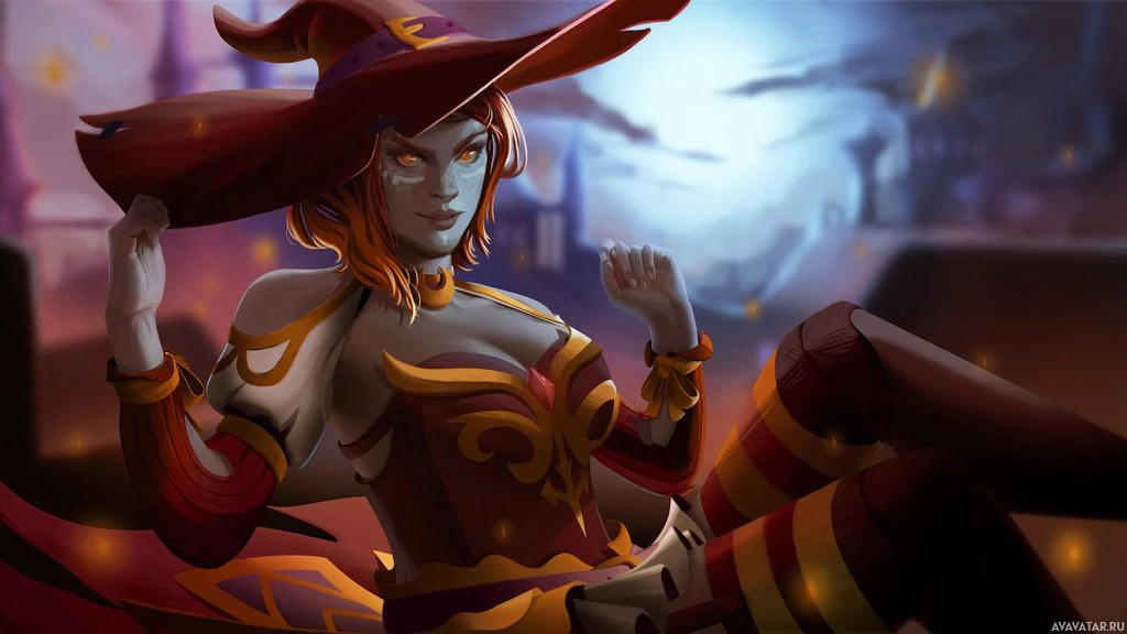 an animated character wearing a witch hat, which is associated with the game Dota 2. The character is dressed in what appears to be witch-themed attire, complete with