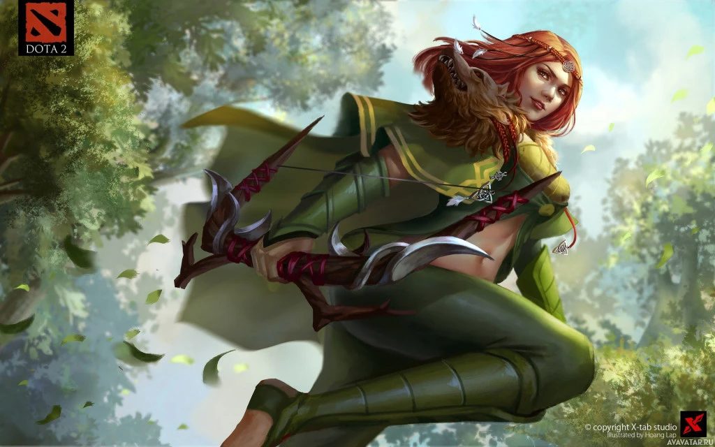 the video game Dota 2, specifically Windranger. She is depicted in an artistic and dynamic pose, with one hand on her hip and the other holding what appears to be a bow, suggesting she is ready for combat or adventure. Her outfit consists of armor with gold accents, and she has a distinctive hairstyle with