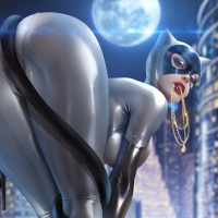 the Batman comics and media franchise. She is shown in her iconic costume with a tail and cat ears, sitting on a rooftop at night with