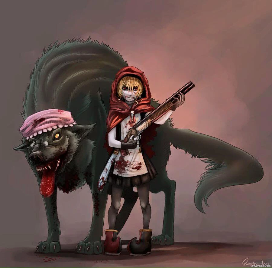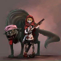 the fairy tale "Red Riding Hood," who is now armed with a weapon and has transformed into a vigilante. Accompanying her is a wolf, but instead of being