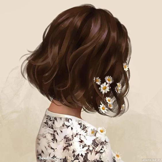 brunette hair. She appears to have flowers, specifically daisies, scattered on her hair or resting against it, which gives an impression of a light,