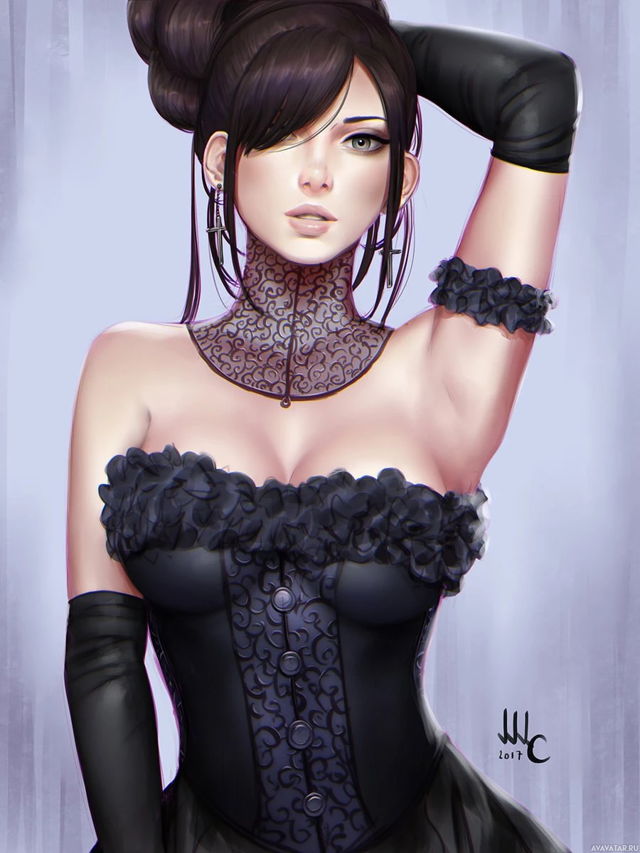 female character, who appears to be wearing an elaborate black dress with puffy sleeves and a corset, accented by what looks like a pearl necklace or choker. Her hair is styled up in an elegant fashion, and she has