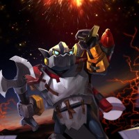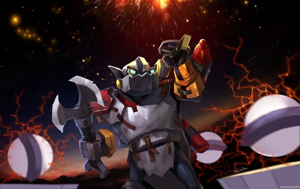 an animated character, likely representing Clockwerk from the game Dota 2. The character is standing with