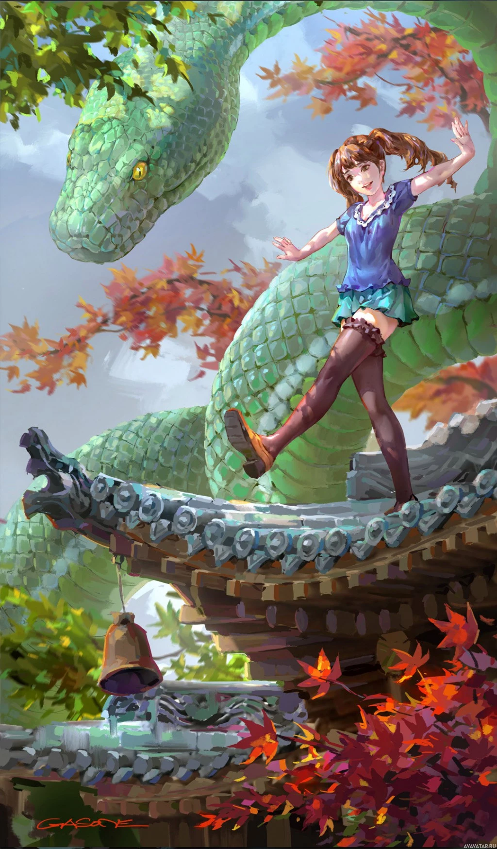 menacing snake with its mouth wide open as if it is attempting to bite the girl. The background shows autumn foliage, suggesting that this scene might be taking place in