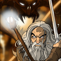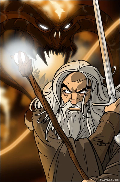 The image shows an illustration of a character who appears to be Gandalf from "The Lord of the Rings" series. He is depicted in a stance that suggests he is confronting a creature resembling a Balrog, which is another iconic creature from "The