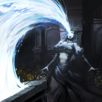 glowing eyes, surrounded by an aura of blue light. This character appears to be casting or creating a wave or arc of light that resembles water, which rises in front of them, adding a dynamic element to the image. The setting seems to be outdoors at dusk or dawn due to