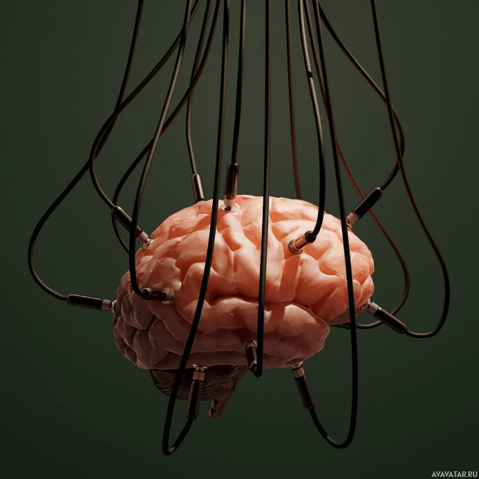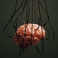 multiple wires extending from the device, and they are connected to the brain through electrodes. The background is