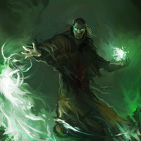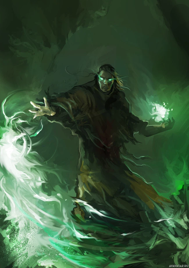 green energy or smoke is emanating, suggesting the use of magic. The background appears dark and ominous, adding to the otherworldly