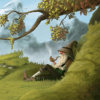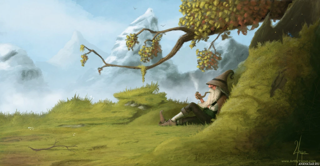 the fantasy atmosphere, such as magical trees with fruit and birds flying around. The character in the foreground does not resemble Gandalf from J.R.R. Tolkien's works; rather, they appear to be an ordinary person enjoying a moment of solitude or relaxation in this picturesque environment.