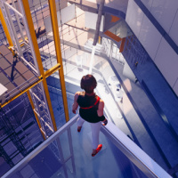 the video game "Mirror's Edge." In the foreground, there is a person standing on what seems to be a glass or reflective floor, looking down at their reflection in the floor. Above them, a complex structure of scaffolding and industrial machinery suggests