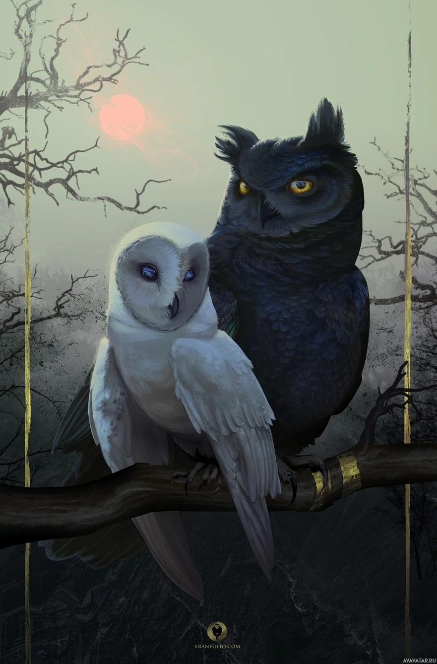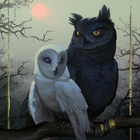 a full moon or another celestial body above them. The artwork is detailed and has a magical or fantastical quality to it.