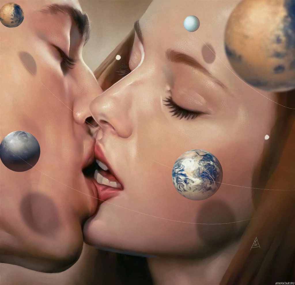 celestial bodies that resemble planets, suggesting a romantic or intimate moment set against the backdrop of space. The