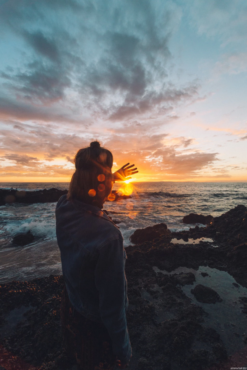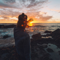 the vibrant sky, and her hands are raised up towards it as if she is embracing the moment or trying to capture the sunset in her palms. This image captures a serene and picturesque scene of nature's beauty during twilight.