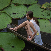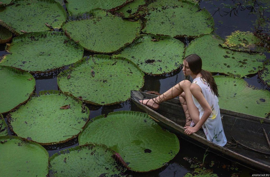 lily pads scattered across its surface, suggesting a natural and serene environment. The individual is wearing light clothing suitable for warm weather, which is typical attire for