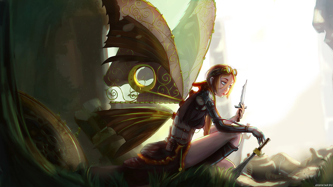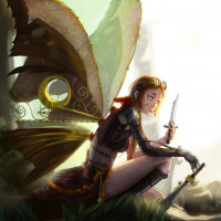 a large butterfly, which has a detailed and realistic appearance. The character is holding a staff or weapon in one hand and a bow in the other, suggesting she might be a warrior or hunter of some sort. Her attire includes armor and
