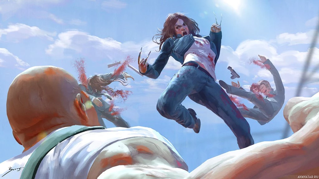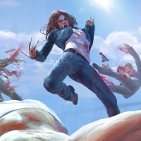 an animated scene that appears to be inspired by the Marvel Comics character X-23, also known as Laura Kinney. She is in the center of the frame, wearing a red and black outfit, with her claws extended. Above her are two characters from another
