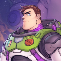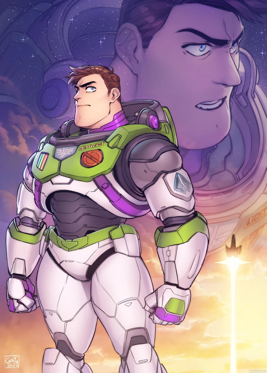 an animated character dressed in a spacesuit resembling that of Buzz Lightyear from the "Toy Story" movies. The character is depicted standing confidently with one hand on his hip, looking towards the viewer. Behind him is a stylized version of another animated character's face, which appears to be a close-up of Woody from the same series. The background suggests an evening or night scene with stars in the sky, adding