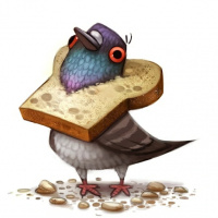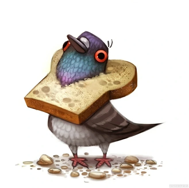 piece of bread in front of the bird, suggesting it might have been eating before. The style of the illustration is whimsical and cartoonish, with exaggerated features that give the pigeon human-like characteristics.
