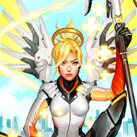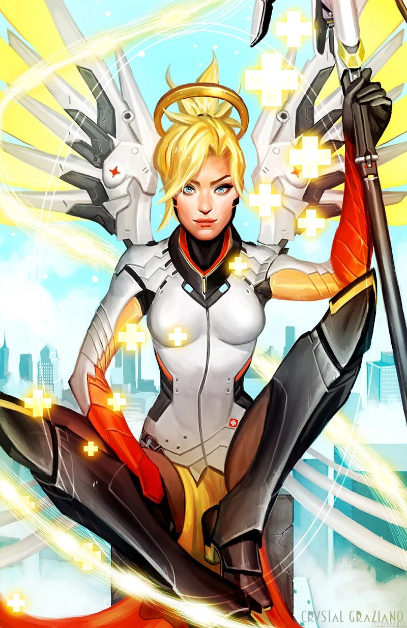 healing staff activated and emitting healing energy around her. Mercy is known for her ability to heal herself and other players, which is represented by