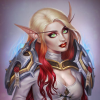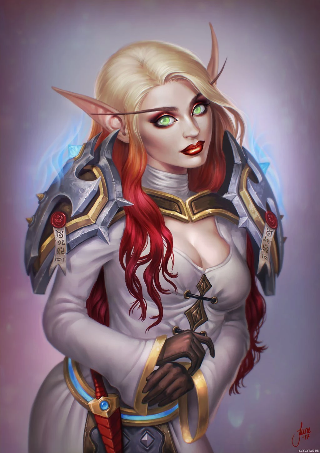 На картинке изображен фантастический персонаж, который кажется эльфом. У нее длинные рыжие волосы, заостренные уши, характерные для эльфов, и она носит то, что кажется доспехами с дизайном, который предполагает, что она может быть частью рыцарского или воинственного порядка в ее фантазийной обстановке. Художественное произведение подробно и красочно, запечатлевая суть традиционных фантазийных архетипов.