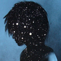 The image shows a silhouette of a person, likely a woman, with her head turned and looking downwards. The background features a cosmic or starry sky, which may suggest contemplation or introspection. The overall impression is one of solitude and thoughtfulness set against an expansive celestial backdrop.