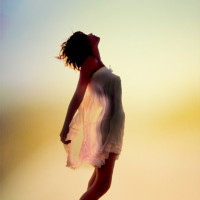 The image shows a person, specifically a woman with her hands raised towards the sky. She appears to be on