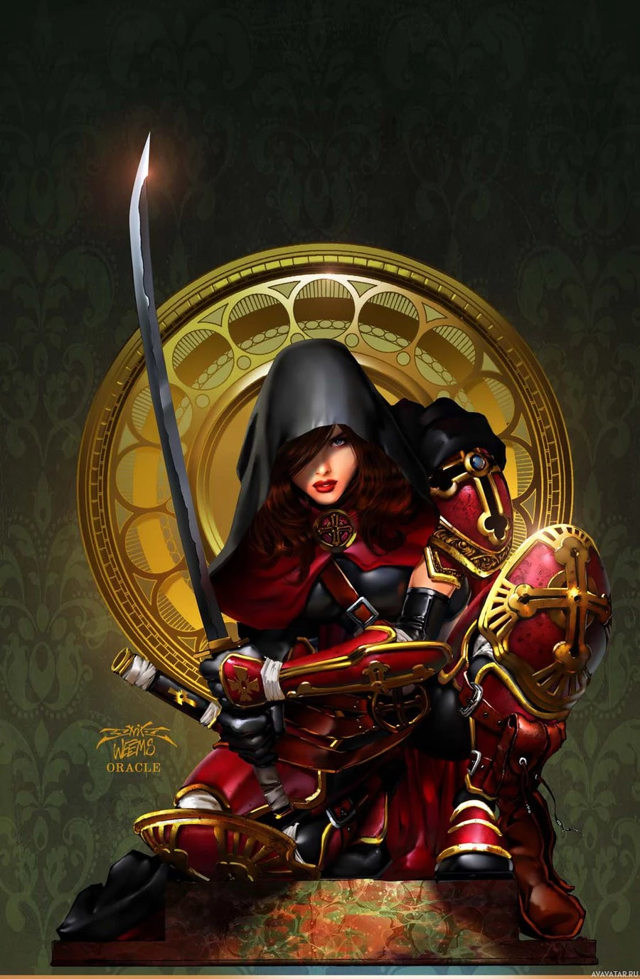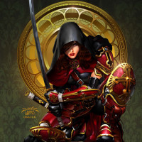 intricate patterns, possibly suggesting a throne or a significant place of power. The artwork showcases detailed and vibrant colors, with a strong emphasis on the character's attire and