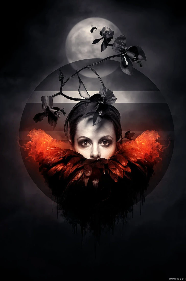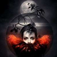 a crescent moon in one corner. There are also leaves and what could be interpreted as feathers around her, adding to the mysterious or dramatic atmosphere of the image. The style of the image is reminiscent of album covers for music that could be described as gothic or alternative rock.