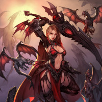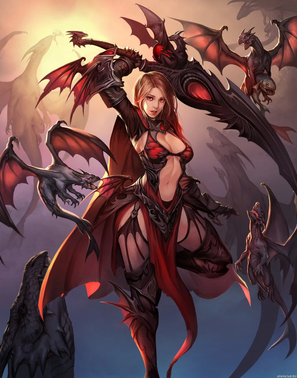 mythical creatures such as dragons and other monsters, suggesting that she might be engaged in battle or some sort of fantastical adventure. The setting looks like it could be an underworld or