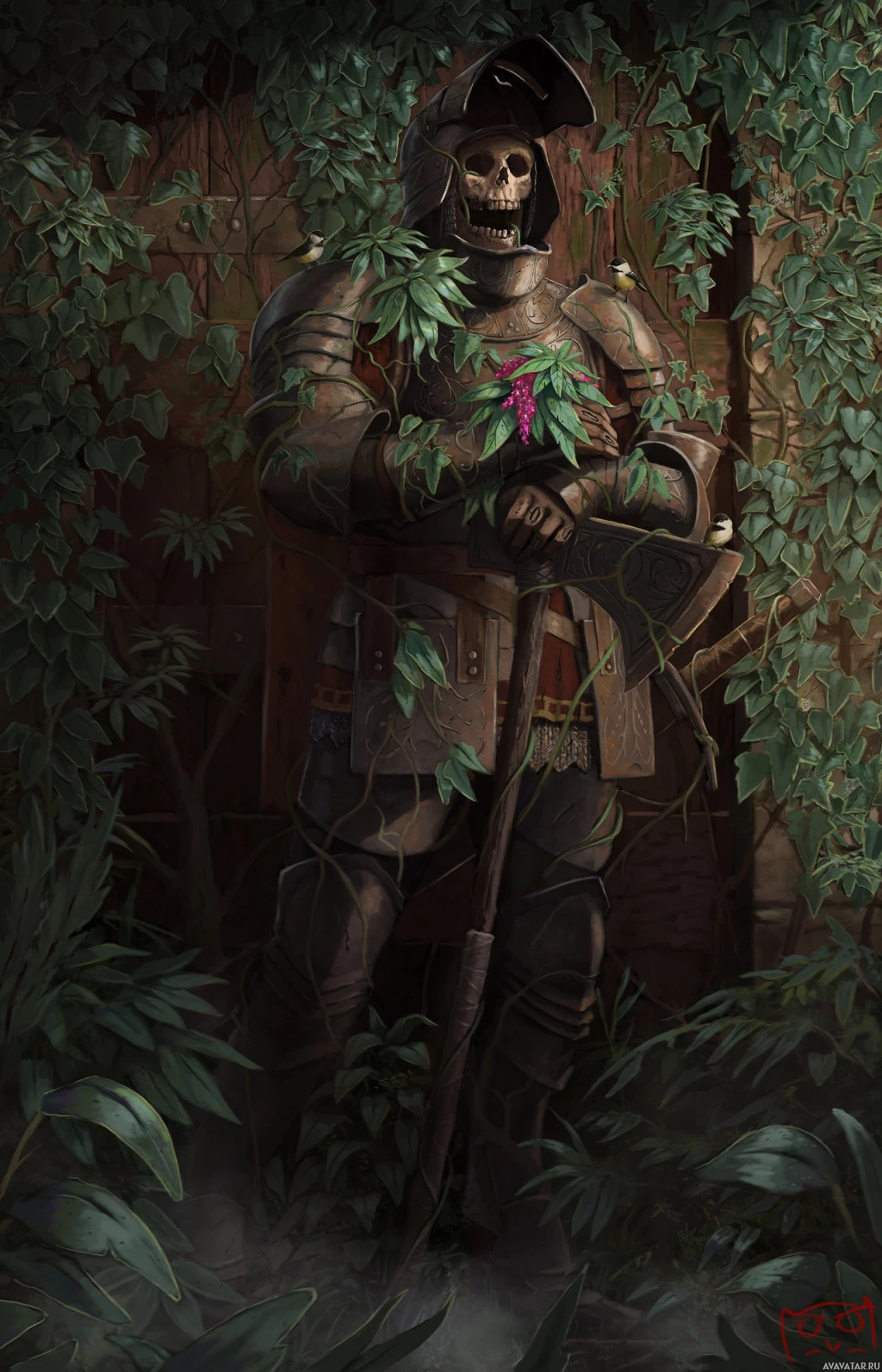 the Grim Reaper or Death itself. The warrior is holding a staff, which might indicate some mystical or supernatural element to their persona, such as being
