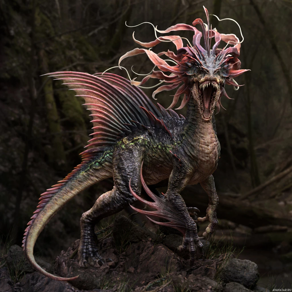 a fantastical creature that resembles a dragon with a serpentine body, fish-like scales, and a long mane. It appears to be an artistic or conceptual representation of a mythical