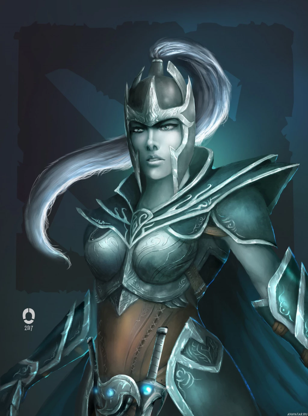 the video game "Dota 2," specifically Phantom Assassin. This character is known for her iconic blue and white armor, which includes a helmet with wings on either side of it, giving her a very powerful and menacing appearance.