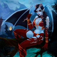 red skin and horns, which she typically assumes when casting her abilities during the game. She is wearing a revealing armor that accentuates her voluptuous figure, complete with spiked shoulders, wings, and a tail.