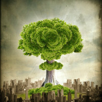 a small plant. This visual is often used to symbolize the impact or consequences of an event, in this case potentially suggesting environmental growth and resilience following catastrophe. The image does not contain any explicit text but conveys its message through the visual elements.