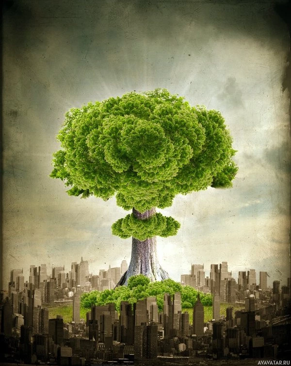 a city skyline at the bottom. From this explosion emerges a large, lush green tree that appears to be growing from a seed or