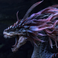 The image shows a fantastical dragon creature with scales, wings, and an open mouth. The dragon is set against a dark background that could be interpreted as the night sky or a cave-like environment.