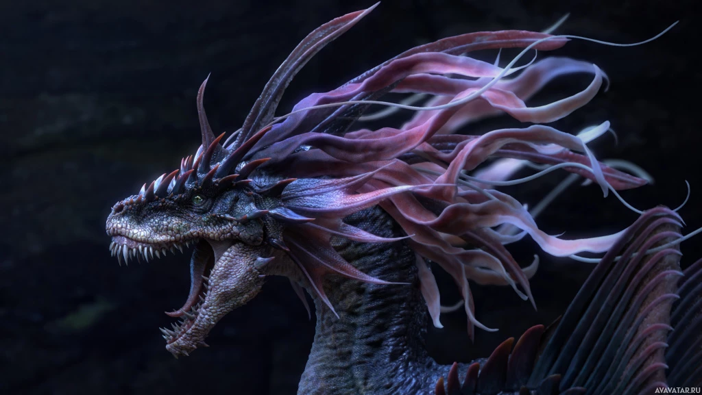 На картинке изображено фантастическое драконье существо с чешуей, крыльями и открытым ртом. Дракон расположен на темном фоне, который можно интерпретировать как ночное небо или пещерную среду.