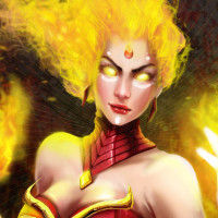 fiery abilities, with flames around her hands and head. Her attire consists of a red and gold armor, which is characteristic of her appearance in the game. The image has been edited to enhance