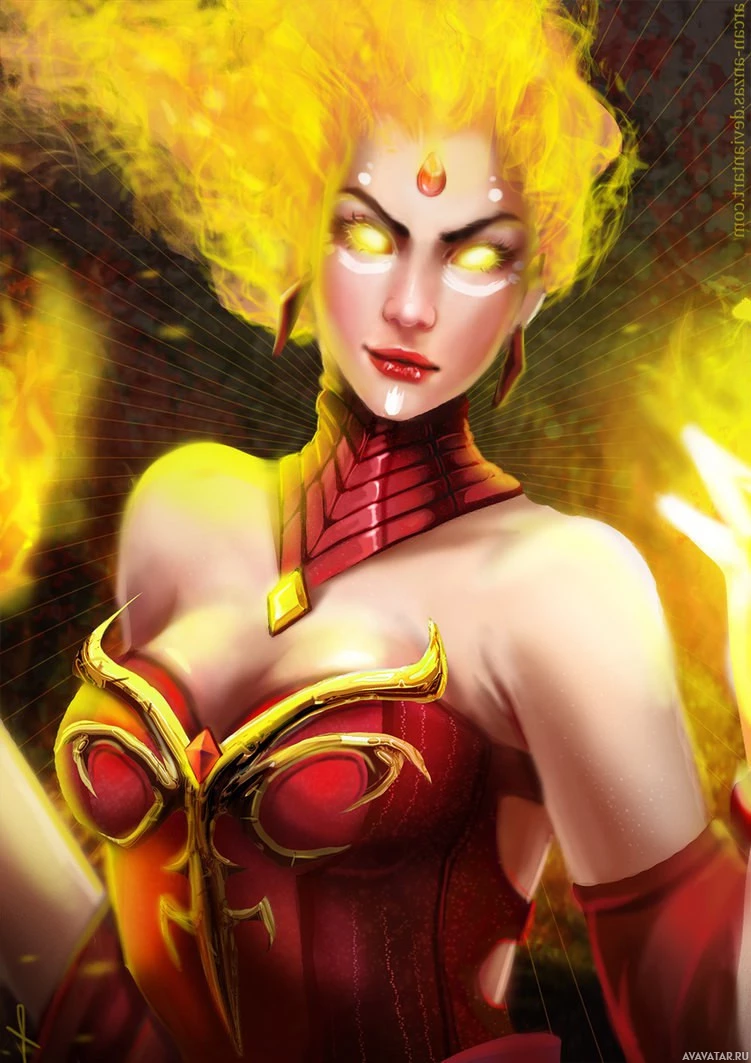 a female character who appears to be Lina, a popular hero from the video game "Dota 2." She is illustrated in an artistic style that showcases her