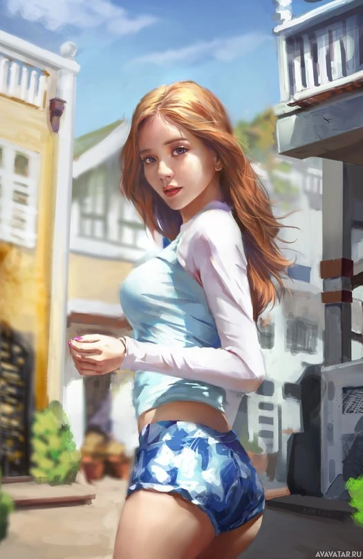 На картинке показана стилизованная иллюстрация женского персонажа. У нее рыжие волосы, она носит без рукавов верх и шорты и, кажется, идет по улице с домами на заднем плане. Важно не делать предположений на основе таких изображений, поскольку они не всегда могут точно представлять реальных людей или ситуации.
