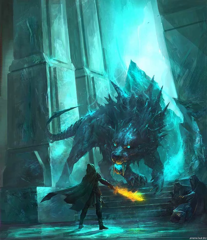 glowing eyes, suggesting it may have supernatural powers or abilities. The setting appears to be a dark, icy cavern or underground chamber, with a mosaic of blue and white shades dominating the background, creating